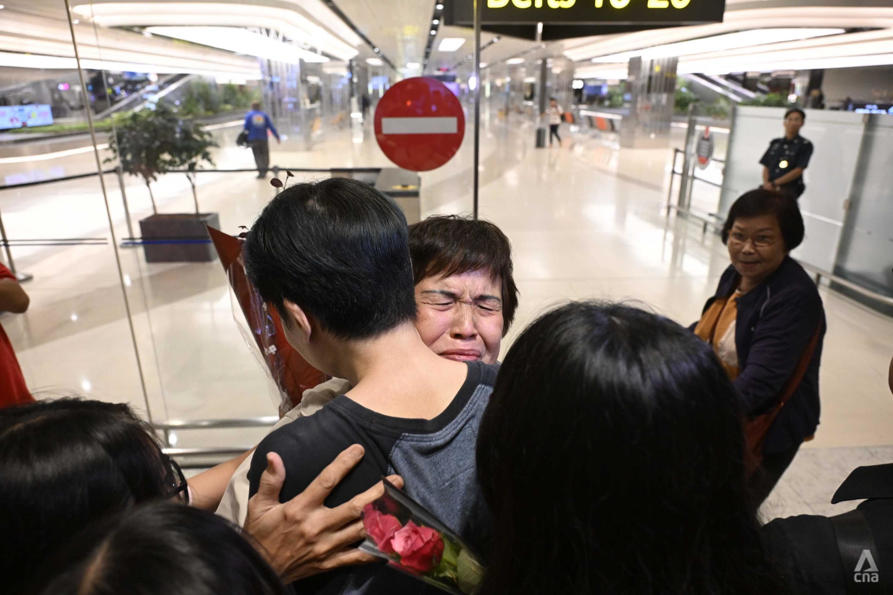 Mdm Chan, 73, was teary-eyed as family members and friends welcomed her home with hugs and flowers at Changi Airport Terminal 1.