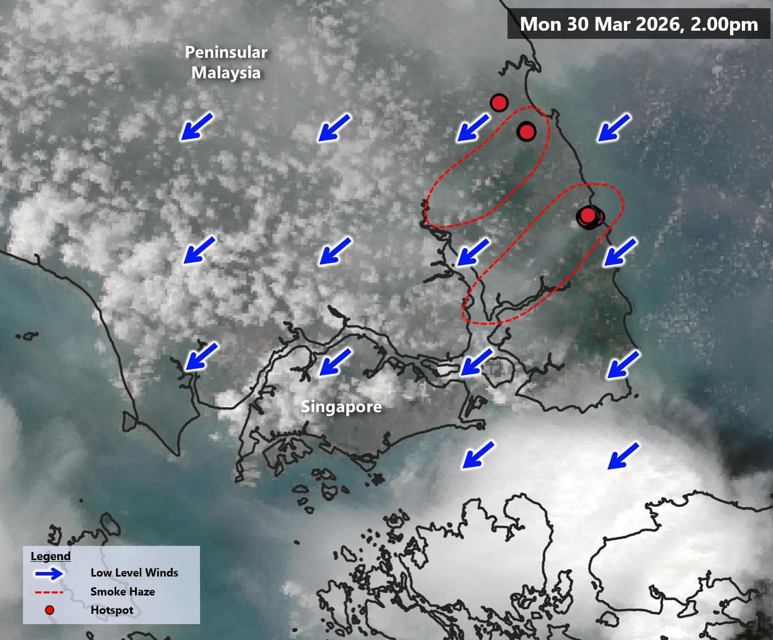 SINGAPORE: Hotspots in eastern Johor were spotted, with winds causing smoke plumes to drift towards Singapore, the National Environment Agency (NEA) said on Monday (Mar 30).