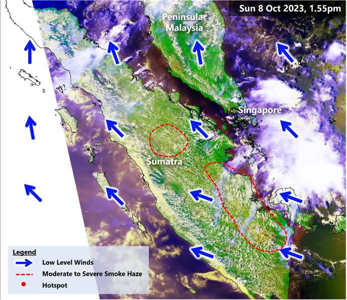 “Moderate to dense smoke haze was observed from satellite imagery over central and southern Sumatra, blowing towards the northwest by prevailing winds.”