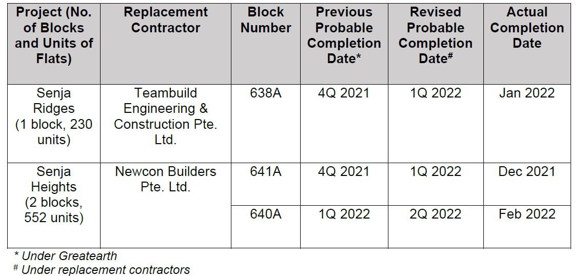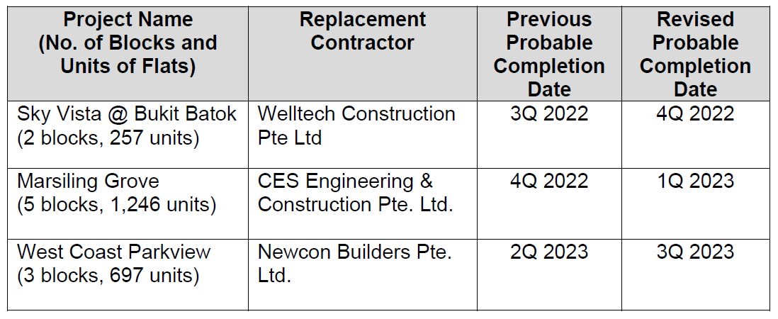 New construction firms were then appointed to take on the jobs, with a revised probable completion date in the first quarter of 2022 for a block at Senja Ridges in Bukit Panjang.