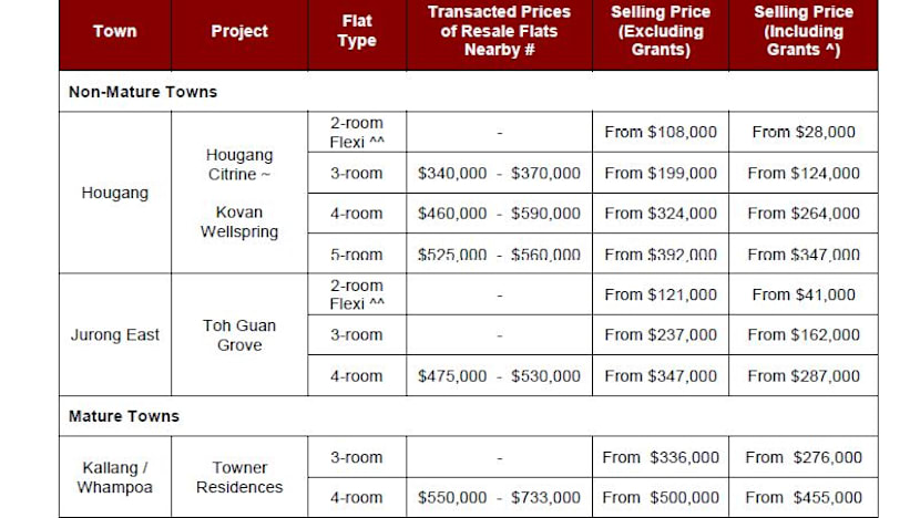With the grant, flat buyers will pay prices starting from S$28,000 for a two-room flexi flat, S$124,000 for a three-room flat, S$264,000 for a four-room flat, and S$347,000 for a five-room flat.