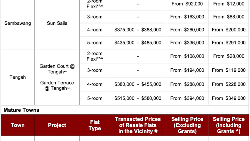 Starting prices for flats in non-mature towns range from S$92,000 for a two-room flexi unit in Sembawang to S$394,000 for a five-room unit in Tengah, excluding grants.