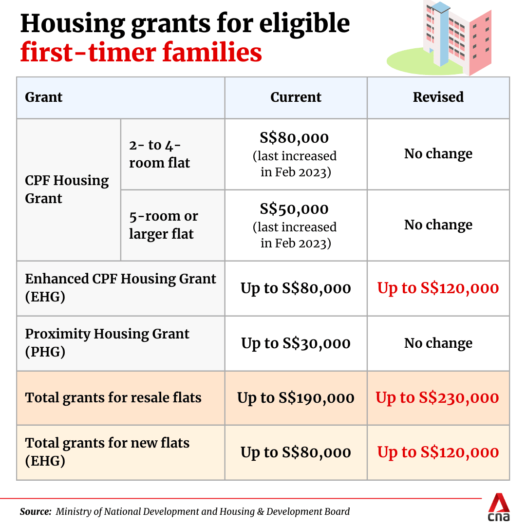 Currently, eligible first-timer families can receive up to S$80,000 under the Enhanced CPF Housing Grant.