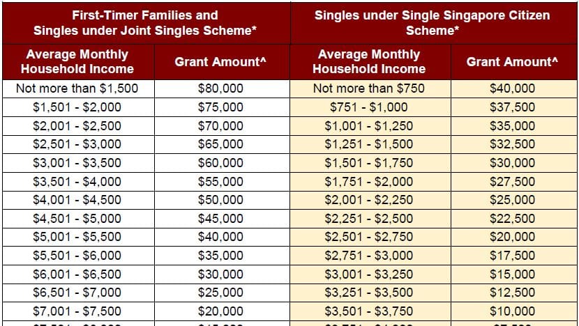 Before: Families buying their first new HDB flat could receive up to S$80,000 in grants. This comprises a S$40,000 Additional CPF Housing Grant (household incomes must be S$5,000 or below) and a S$40,000 Special CPF Housing Grant if they are buying a four-room or smaller flat in a non-mature estate (household monthly incomes must not exceed S$8,500).