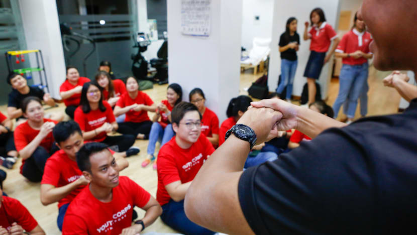 Youth Corps Singapore volunteers learning how to teach seniors hand-washing at the Loving Heart Multi-Service Centre in Jurong on Feb 21, 2020. Photo: Yong Jun Yuan/TODAY