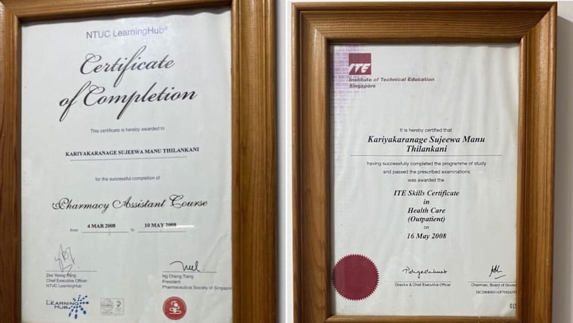 Yuen paid for Mdm Sujeewa to undergo two healthcare courses in 2007 and 2008, and she obtained an Institute of Technical Education Skills Certificate in Health Care (Outpatient) and one for a Pharmacy Assistant Course by NTUC LearningHub.