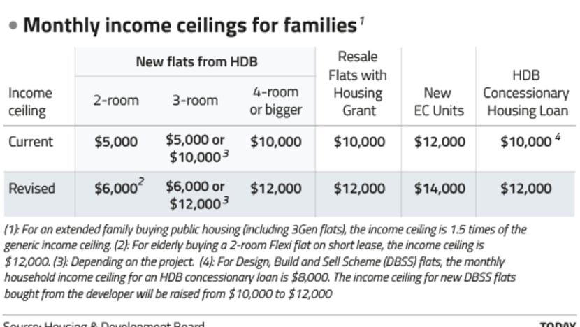 Revealing more details today, the Ministry of National Development and Housing and Development Board said more than 21,000 families benefited after income ceilings were raised in 2011. The authorities did not have figures as to how many would benefit this time.