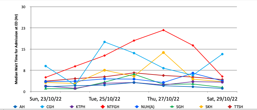 Latest data available from Ministry of Health (MOH) showed that the median waiting time for admission to wards from emergency departments was between one hour and 21.7 hours for the week of Oct 23.