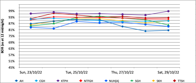 Among hospitals tracked by the MOH, latest figures show that daily bed occupancy rates ranged from 79.7 per cent to 98.7 per cent between Oct 23 and Oct 29.