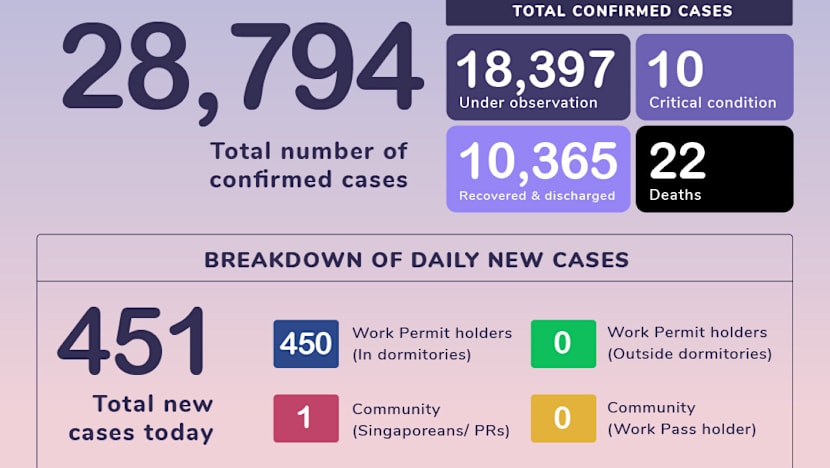 SINGAPORE — A household contact of the service ambassador at Bishan MRT Station who contracted Covid-19 recently was the only Singaporean among the 451 new cases of infections reported on Tuesday (May 19).