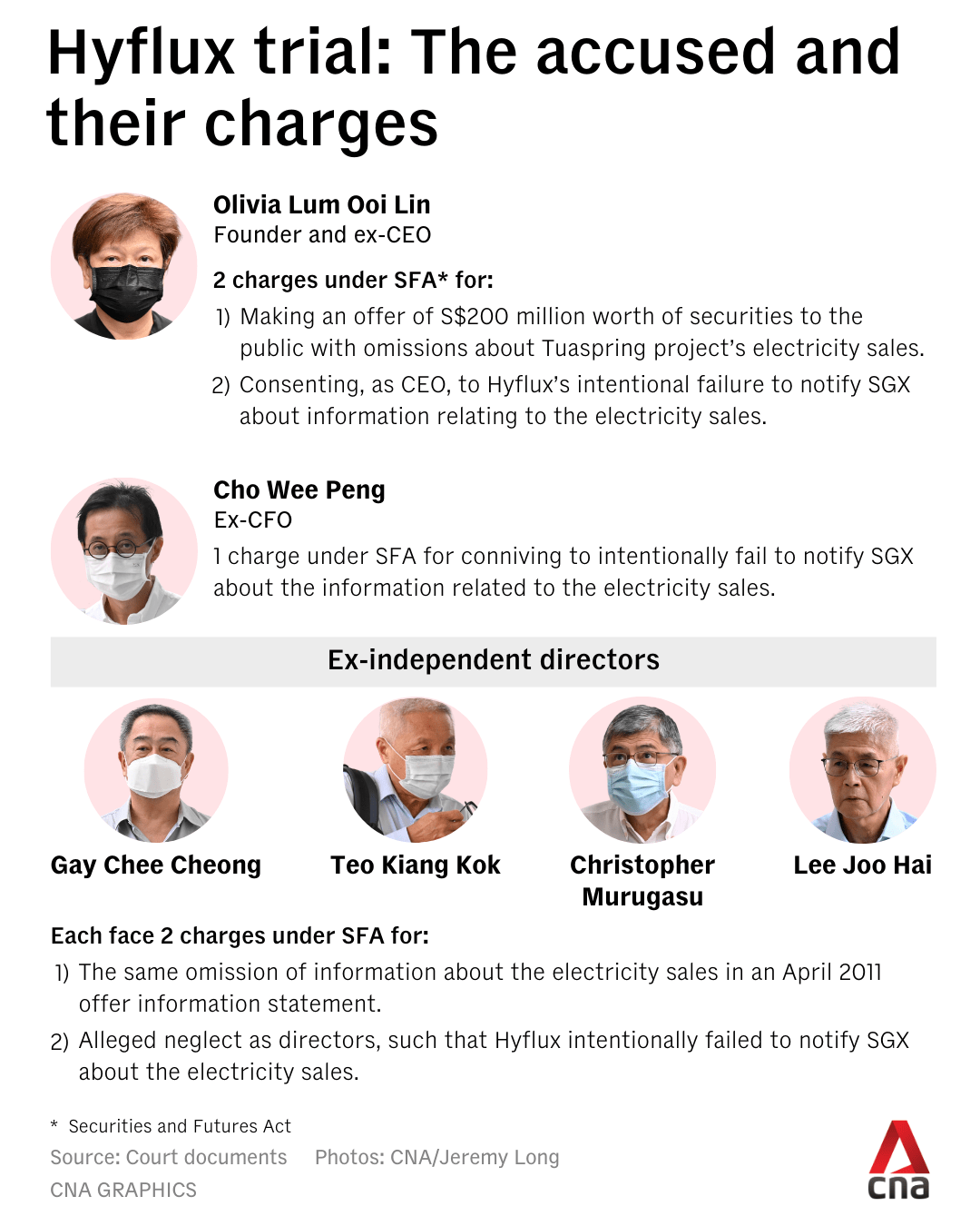 Along with then-chief financial officer Cho Wee Peng and four former independent directors of Hyflux, Olivia Lum is on trial for allegedly omitting details about electricity sales in its Tuaspring project.