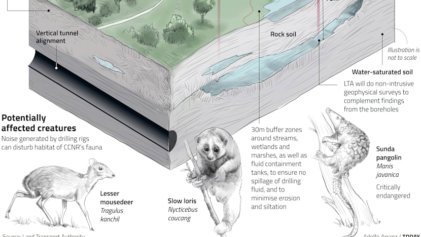 The mousedeer, slow loris and critically endangered Sunda pangolin have distinct home ranges, and movement away from the noise or human activities “may potentially bring such fauna into territorial conflict such as increased competition for food and shelter, particularly in a highly fragmented habitat like that in the CCNR”, stated the Environmental Impact Assessment (Phase One) gazetted by the LTA last Friday (Feb 5).