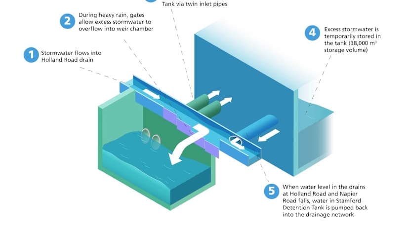 "The excess stormwater will flow from the drains into a weir chamber where a pair of inlet pipes will then channel the water into the SDT by gravity," said the PUB.