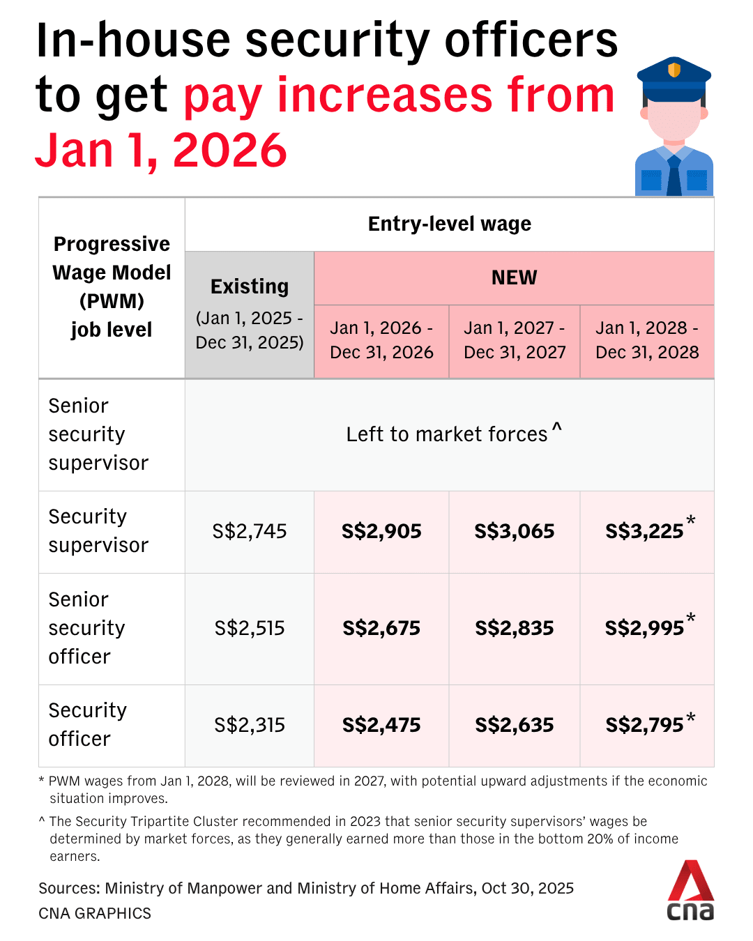 From Jan 1, 2026, about 1,500 full-time in-house security officers will see their wages rise to at least the new entry-level PWM wage of S$2,475.