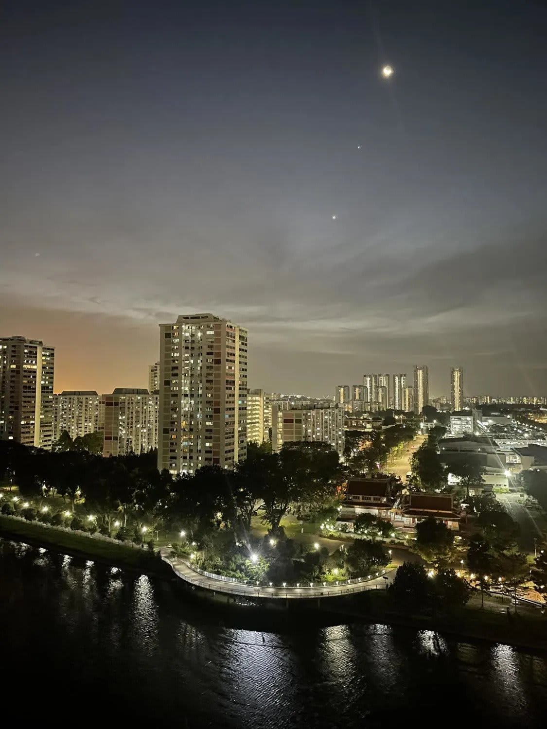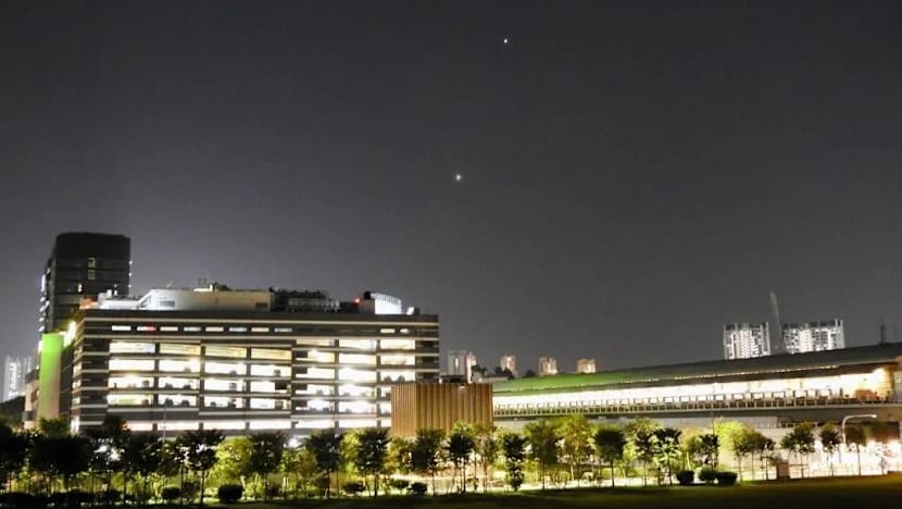 CNA reader A Kannan captured the sight from an open field in Woodlands. The image, framed by Housing Board blocks and the nearby Causeway Point mall, showed the moon and two planets clearly lit.