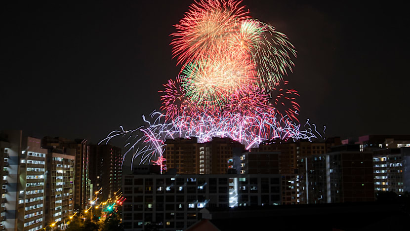 Fireworks above Jurong Lake Gardens as seen from Block 316 Jurong East Street 32 on Aug 9, 2020.