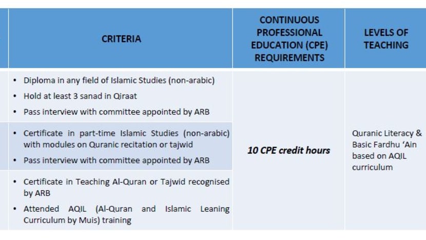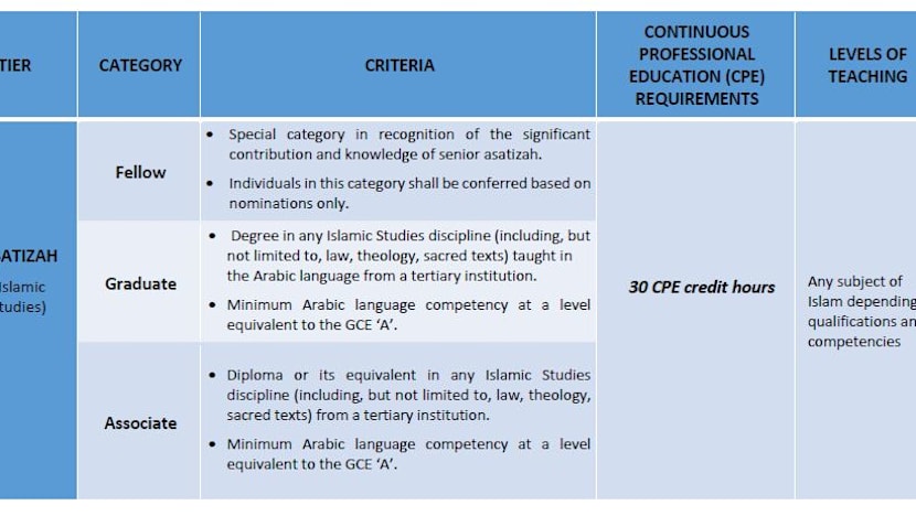 Under these standards — split into two tiers, one for asatizah and another for Quranic teachers — asatizah will need to undergo at least 30 credit hours of continuous professional education (CPE) modules in three years. These include skills-based courses such as counselling, as well as content-based modules such as sociology of religion. Quranic teachers will need to undergo at least 10 credit hours of CPE over the same period of time.