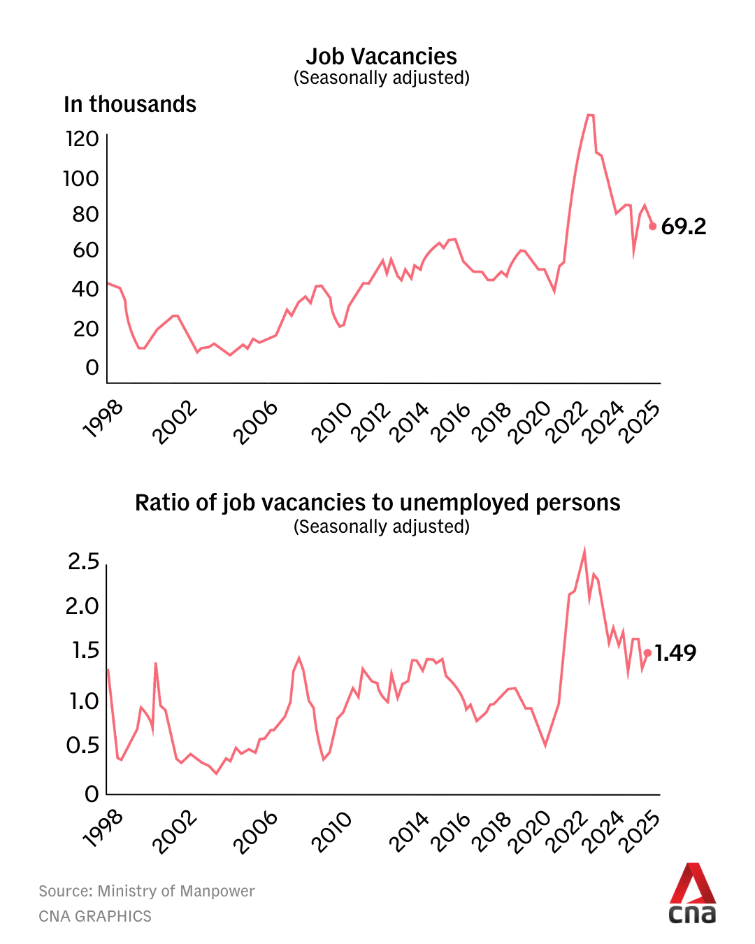 SINGAPORE: Job vacancies in Singapore continued easing to 69,200 in September, down from 76,900 in June, according to third-quarter labour market figures on Thursday (Dec 11).