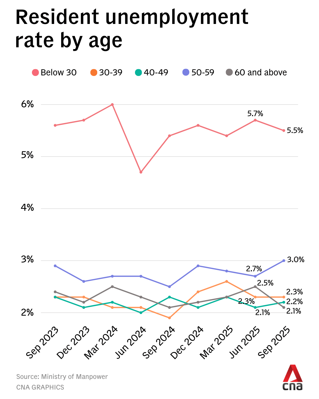 The unemployment rate among older workers aged 60 and above also declined from 2.5 per cent in June to 2.1 per cent in September.