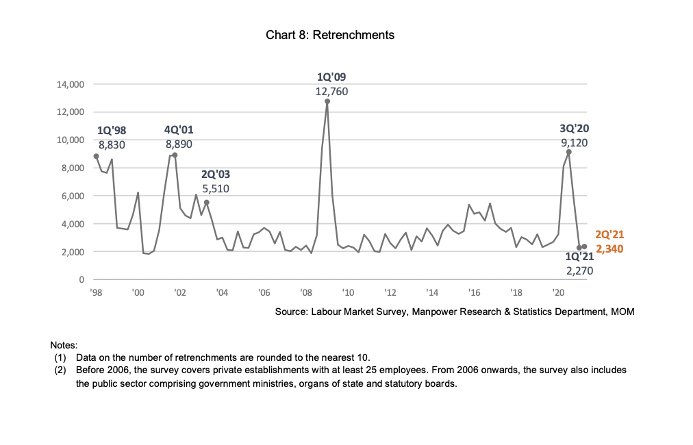 “While the number remained elevated compared to pre-pandemic times, the prevalence of such temporary work arrangements helped to keep retrenchments relatively low in 1H 2021,” said MOM.