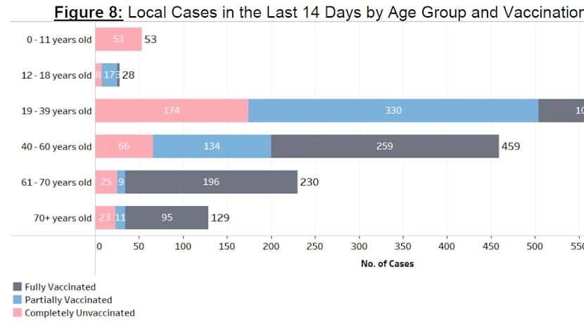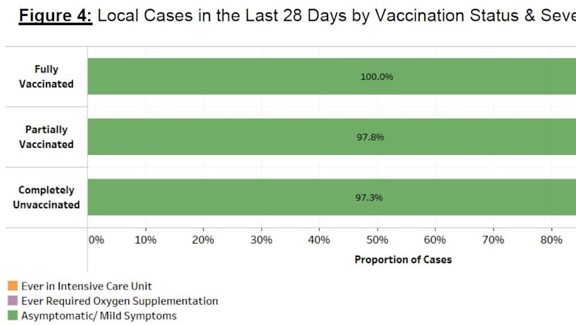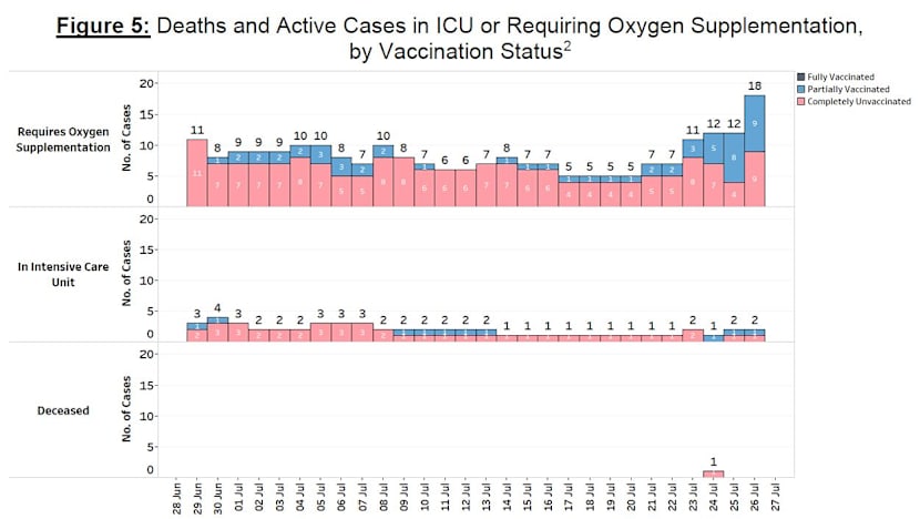“Over the last 28 days, 21 local cases required oxygen supplementation, were admitted to intensive care units or died. Ten were unvaccinated, 11 were partially vaccinated and none were fully vaccinated,” the ministry said.