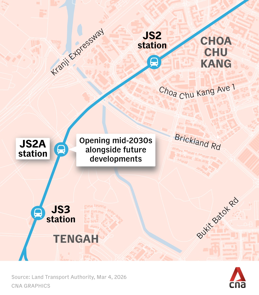 He also announced the addition of another station located between the upcoming Tengah Central and Choa Chu Kang West stations. It is targeted to open in the mid-2030s, in tandem with the completion of future developments surrounding the station.