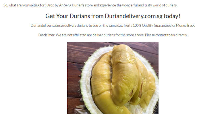 And below that, in a smaller font, are the words: “Duriandelivery.com.sg delivers durians to you on the same day, fresh. 100% Quality Guaranteed or Money Back. Disclaimer: We are not affiliated nor deliver durians for the store above. Please contact them directly.”