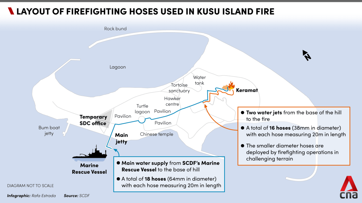 "It was getting dark ... to enter Kusu through the jetty, it's actually a narrow channel and there was restricted visibility ... When we were reaching, we could see the fire at the top (of the hill)," he added.