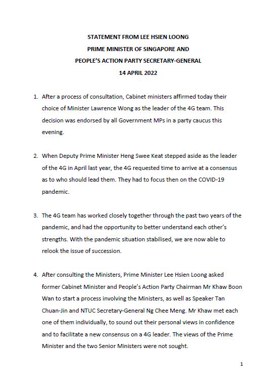 Mr Lee, who is the Secretary-General of the People’s Action Party (PAP), said that when Deputy Prime Minister Heng Swee Keat stepped aside as the leader of the 4G in April last year, the 4G requested time to arrive at a consensus as to who should lead them, as they had to focus then on the Covid-19 pandemic.