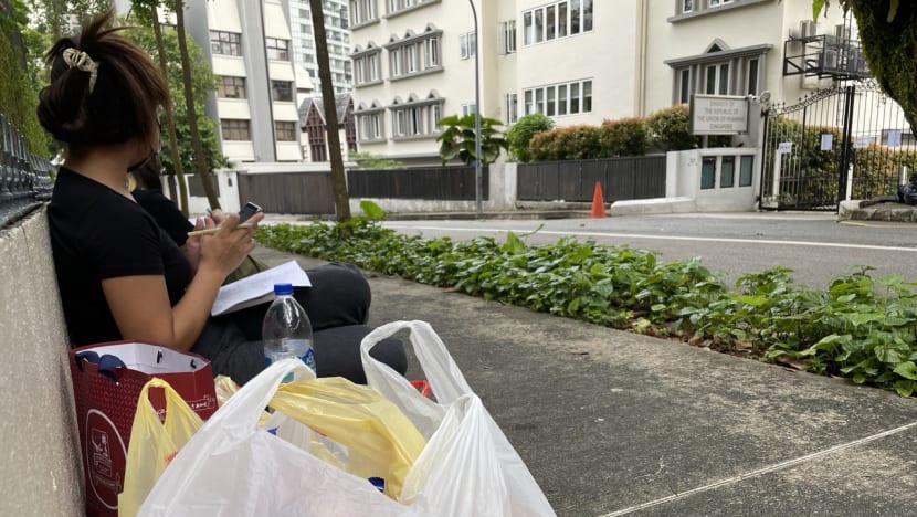 Krystal and Joy had been waiting outside the Myanmar embassy on St Martin's Drive for nearly 12 hours when CNA arrived at about 5pm. The pair needed to get their passports renewed.