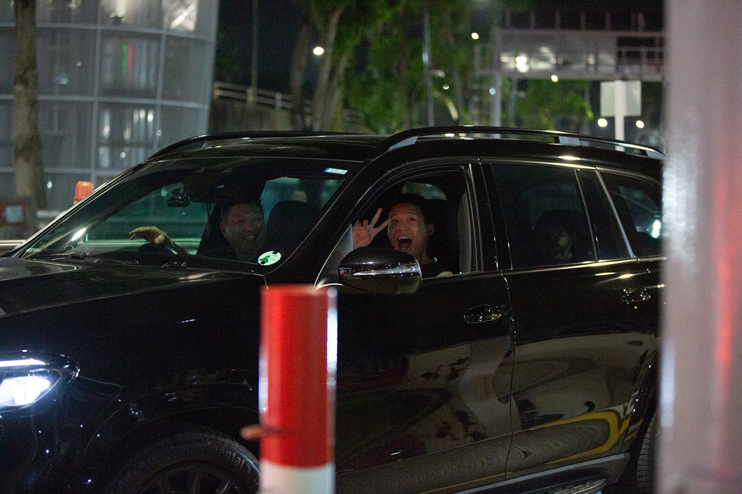 People waving and cheering as they make their trip across the Causeway after midnight on April 1, 2022.