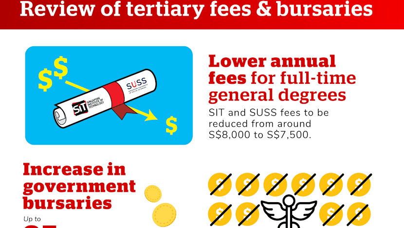 University students can also look forward to higher government bursaries for all government-funded undergraduate courses. For example, the bursaries will cover up to 75 per cent of the fees of general degrees, up from a maximum of 50 per cent today, Mr Lee said.