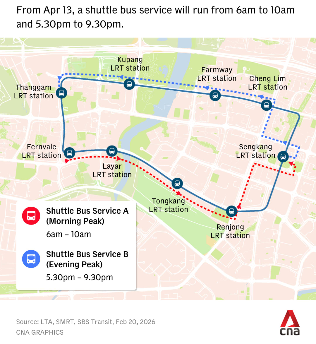 To give commuters time to familiarise themselves, the shuttle service will begin on Apr 13, 2026, one week before the LRT service adjustment begins, and will cease when regular LRT services resume.