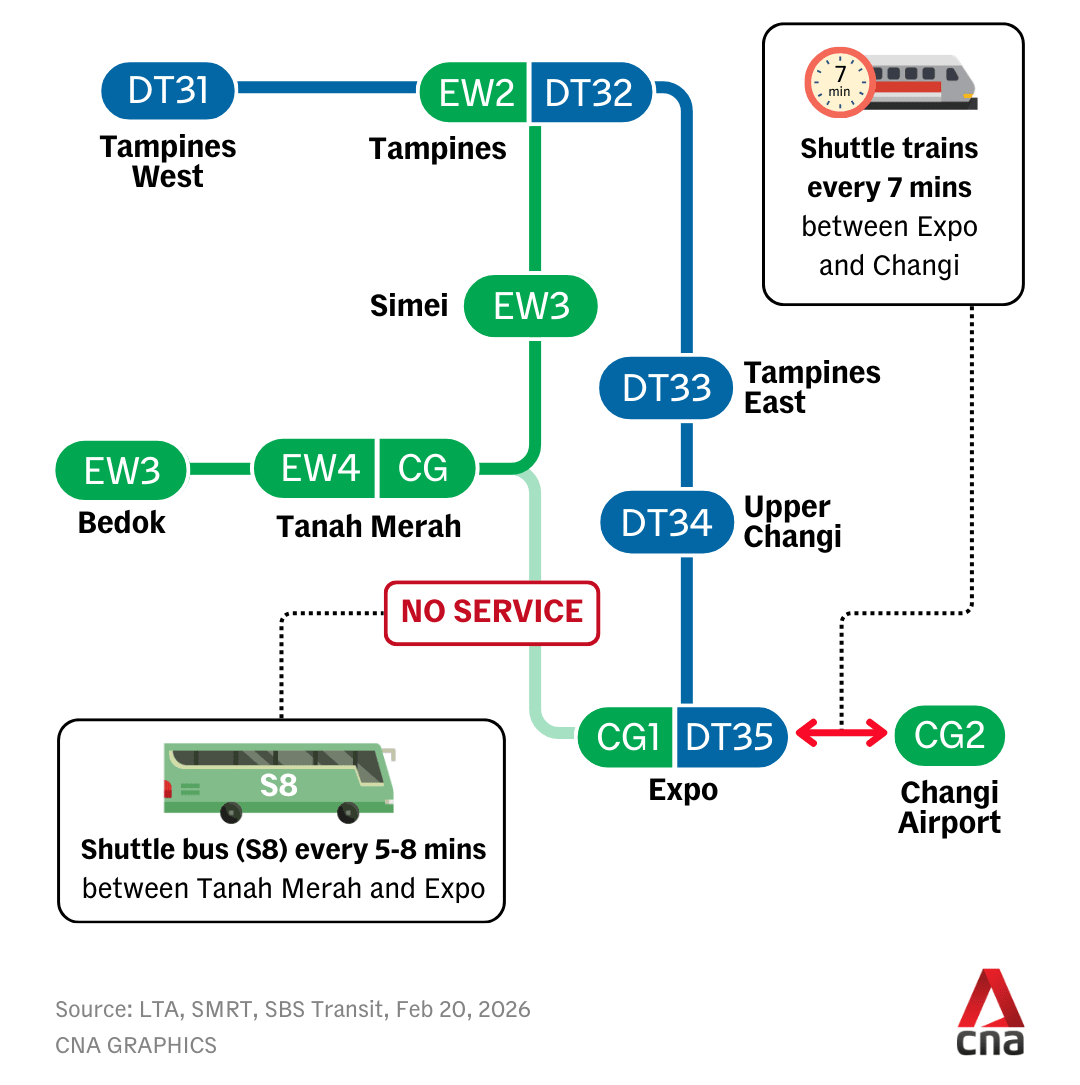 To maintain connectivity, a shuttle bus service will run between Tanah Merah and Expo stations at a frequency of about five to eight minutes during the affected period.