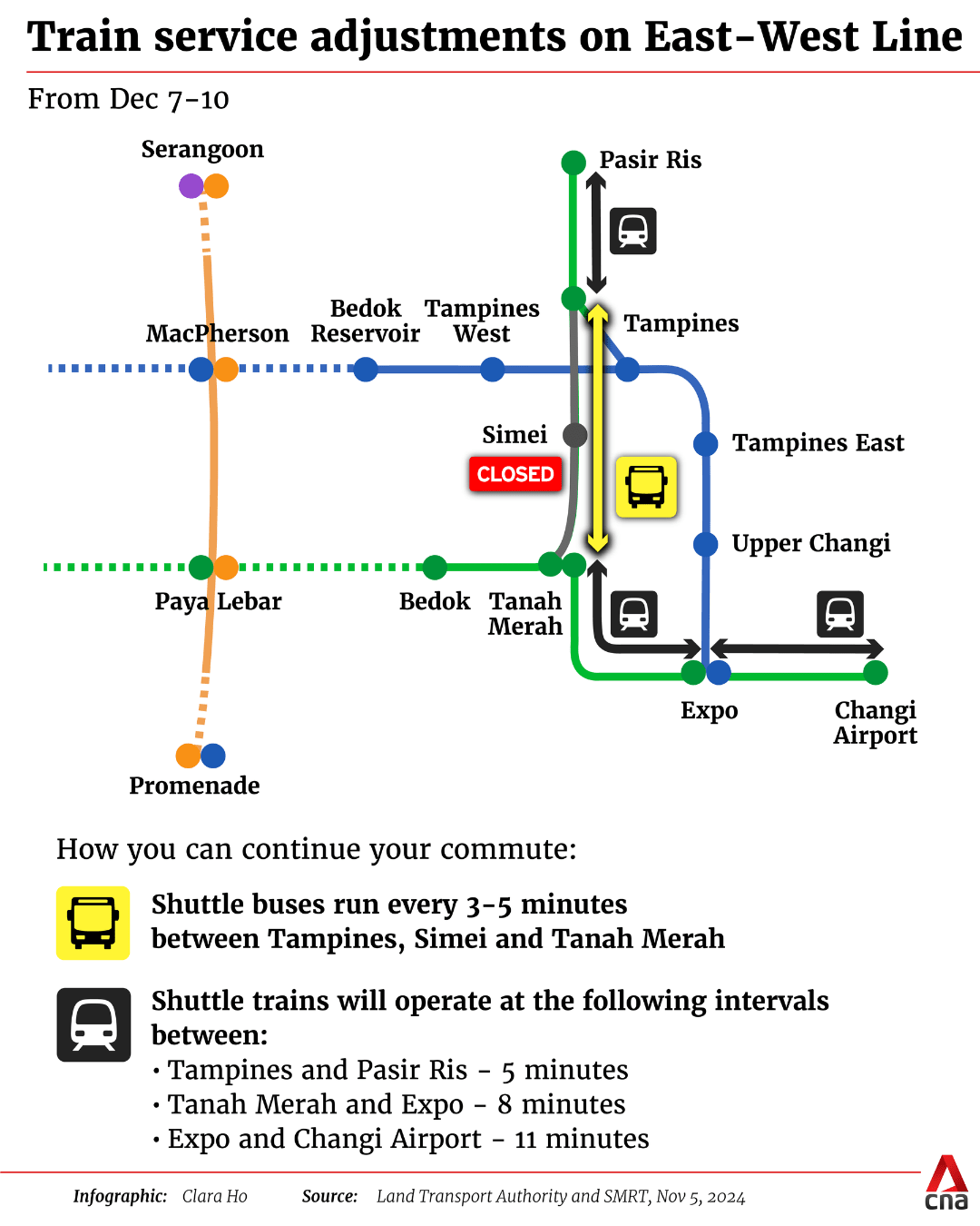 To address this, shuttle trains will operate every five minutes between Tampines and Pasir Ris stations, every eight minutes between Tanah Merah and Expo stations, and every 11 minutes between Expo and Changi Airport stations.