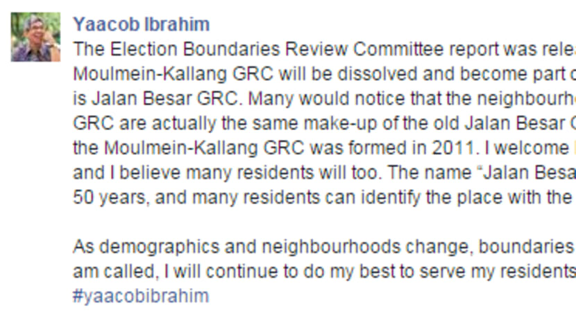 Separately, Fellow Moulmein-Kallang GRC MP Dr Yaacob Ibrahim, said he welcomed the return of Jalan Besar GRC.