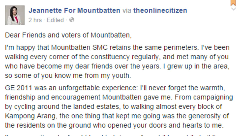 Singapore People's Party member Jeannette Chong-Aruldoss, however, said she was "happy" that Mountbatten SMC, which she contested in 2011, retained the same perimeters, and pledged to "be back at the polls" in the next General Election.
