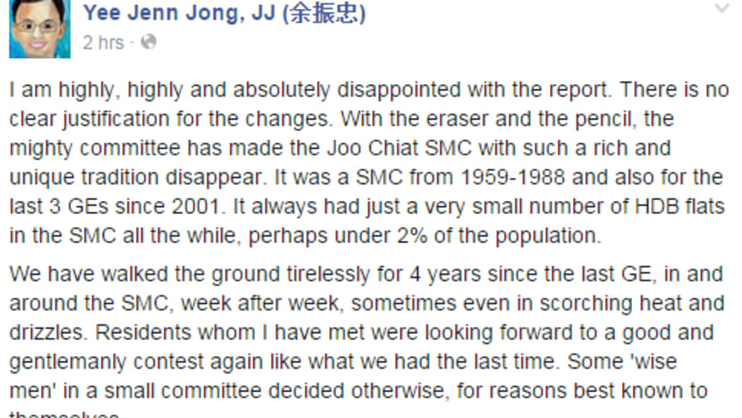 Non-constituency MP Yee Jenn Jong told 938LIVE he was "highly disappointed" that Joo Chiat SMC, which he contested in 2011, would be scrapped. "I believe that Joo Chiat SMC has been an SMC for a long time, from 1959 to 1988, and then from 2001 until now. I would have hoped that Joo Chiat, because of its special characteristics, could have remained as an SMC," he said.