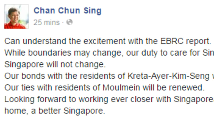 Tanjong Pagar GRC MP Chan Chun Sing also gave his thoughts on the electoral boundaries report. "While boundaries may change, our duty to care for Singaporeans and Singapore will not change," he wrote on Facebook. "Our bonds with the residents of Kreta-Ayer-Kim-Seng will always remain. Our ties with residents of Moulmein will be renewed. Looking forward to working ever closer with Singaporeans for a better home, a better Singapore."