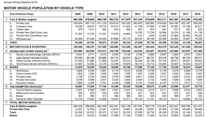 The Department of Statistics (Singstat) said that the trend corresponded to a fall in the total car population in Singapore in the last five years amid the wider availability of transportation alternatives such as car-sharing services.