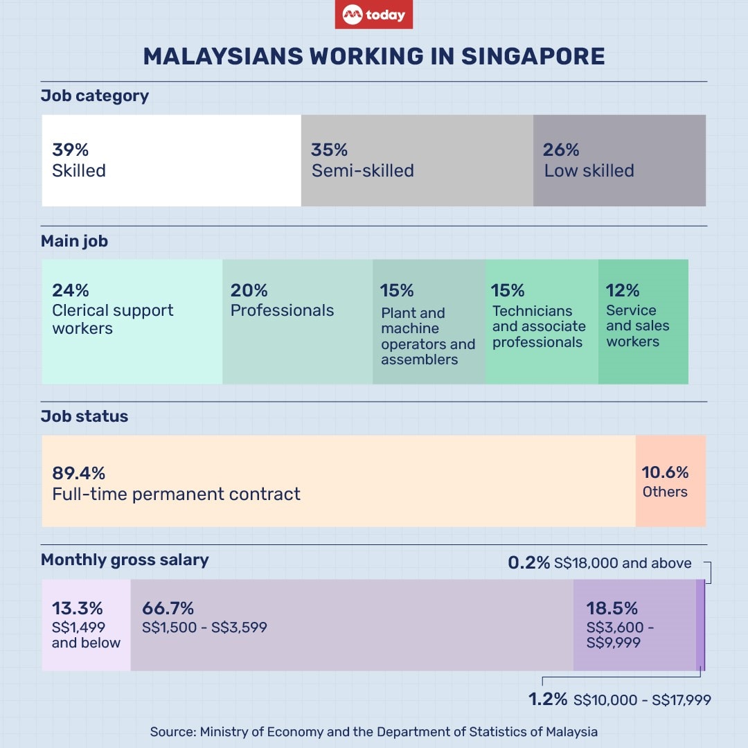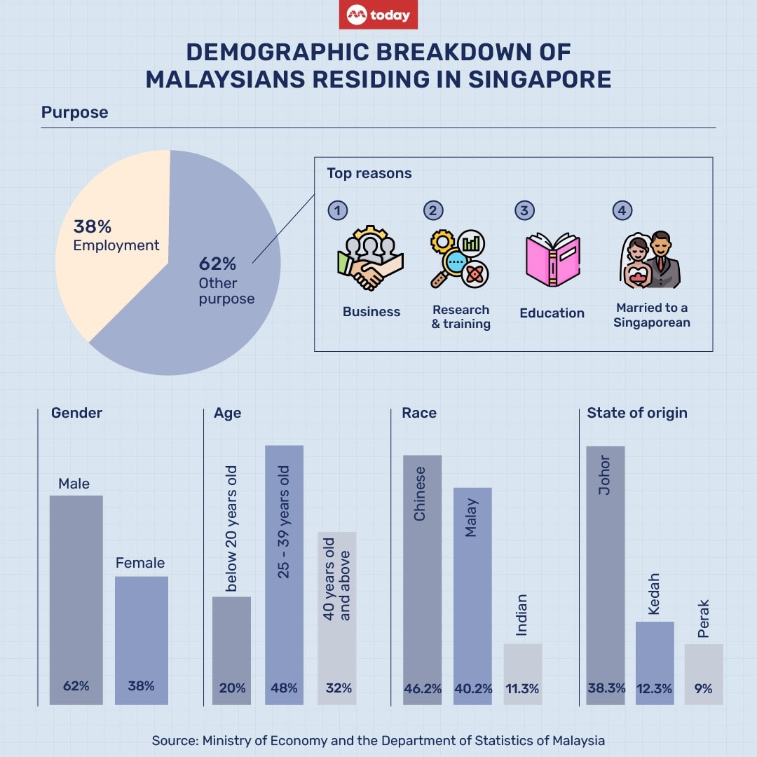 The study, conducted in 2022, also said that 38 per cent of Malaysians here are employed. The rest are engaged in activities such as business, research and education, or are married to a Singaporean.