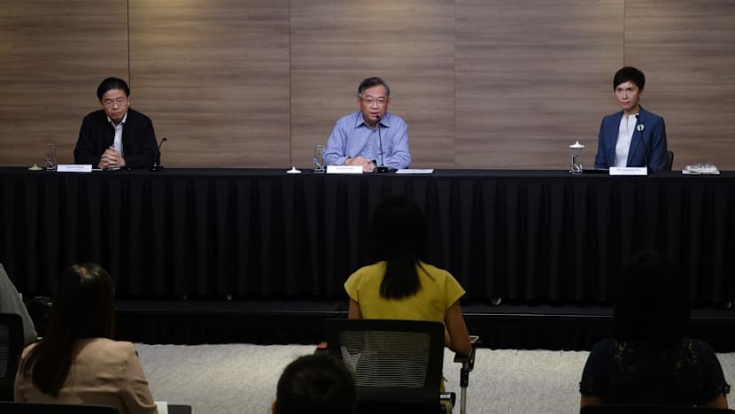 From left: National Development Minister Lawrence Wong, Health Minister Gan Kim Yong and Manpower Minister Josephine Teo speaking at a press conference on March 17, 2020. Photo: Raj Nadarajan/TODAY
