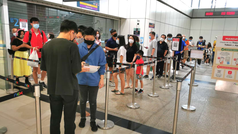 SINGAPORE: Queues formed at the entrances of some shopping malls on Wednesday (Oct 13) as checks on people's COVID-19 vaccination status began.