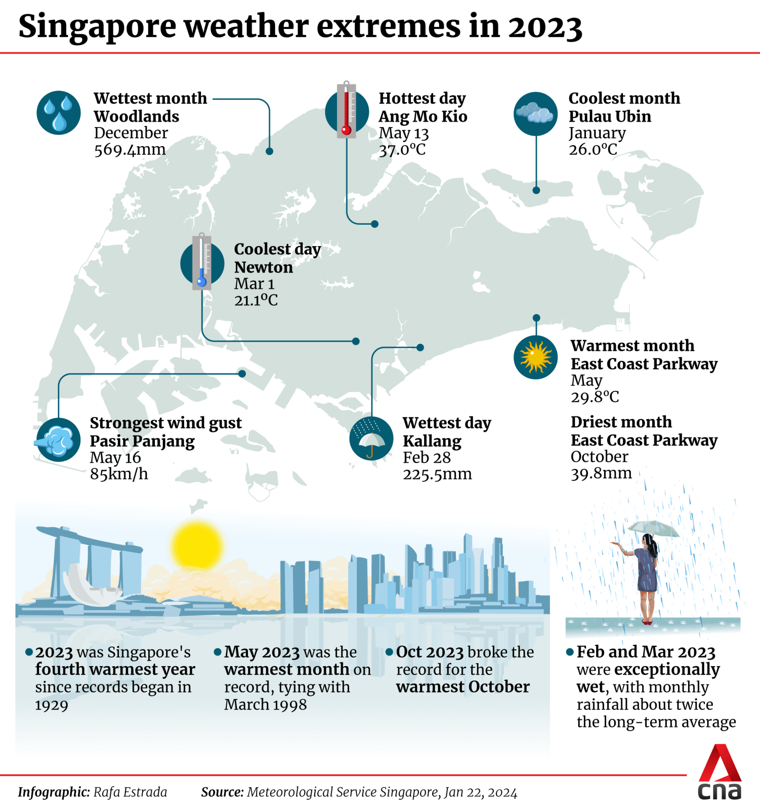 The wettest day of 2023 was Feb 28, with 225.5mm of rain recorded at the Met Service's Kallang station. Singapore saw its coolest day of the year the next day, with a temperature of 21.1 degrees Celsius recorded at the Met Service station in Newton on Mar 1.