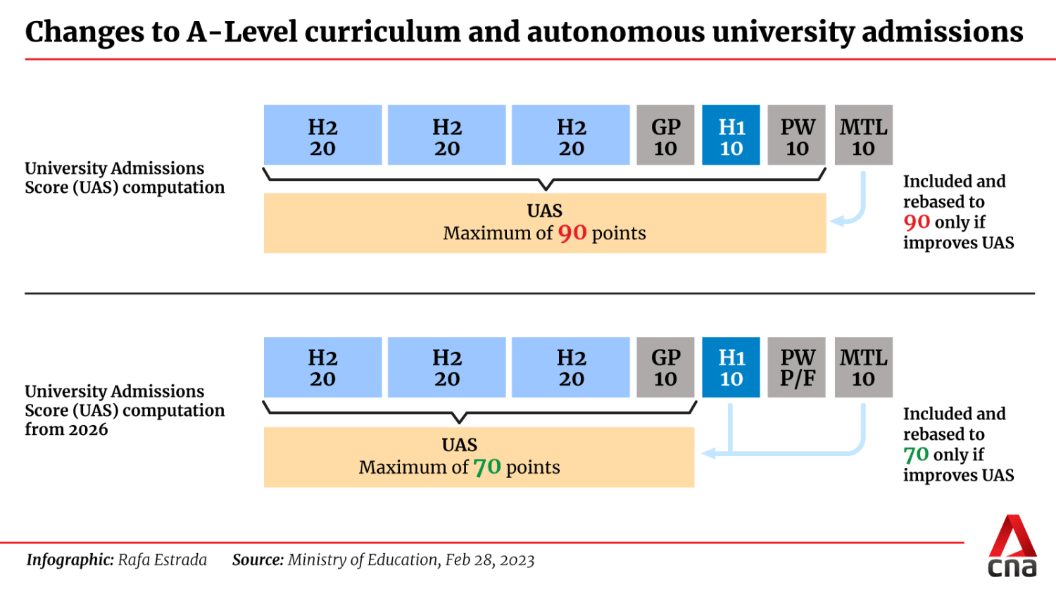 Today, three H2 subjects account for 20 points each. General Paper, Project Work, as well as their remaining content subject account for 10 points each, bringing the highest possible score to 90 points. Mother Tongue, which also counts for 10 points, is included only if it improves the score, and the overall score is then rebased to 90.