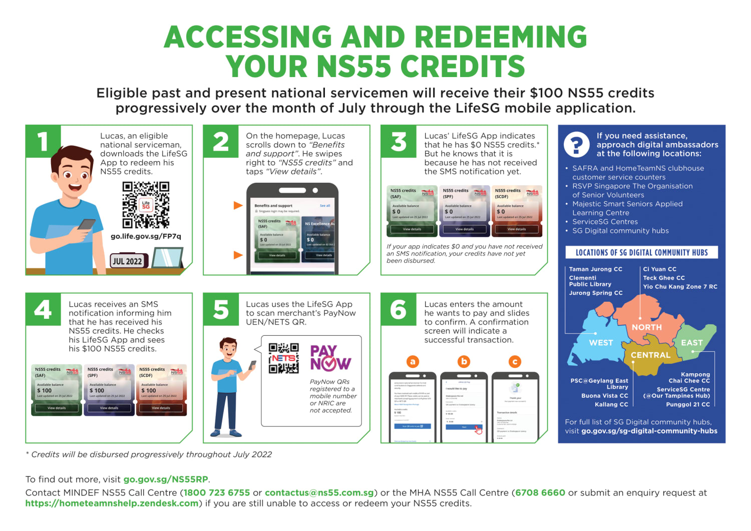After that, they can access their LifeSG mobile app to redeem the credits at any online or physical merchant accepting payment by Scan and Pay via PayNow UEN QR or NETS QR.