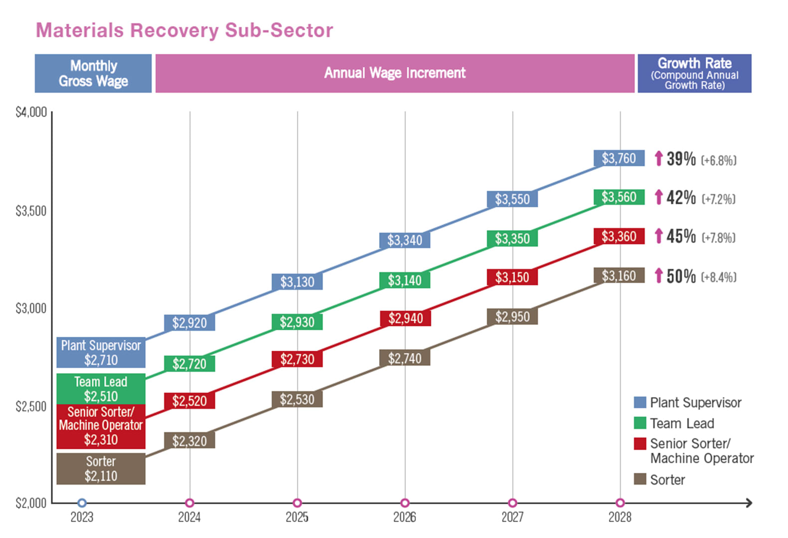 Workers in the materials recovery sub-sector will see their gross wages jump from between S$2,110 and S$2,710 to S$3,160 and S$3,760 over the same period.