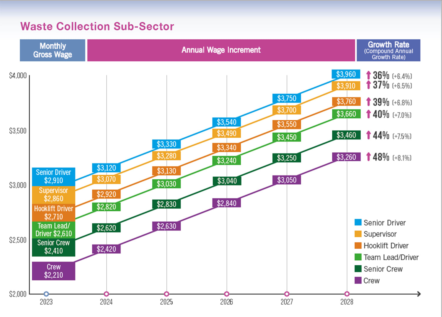 Workers in the waste collection sub-sector can expect a minimum monthly gross wage ranging from S$2,210 to S$2,910 starting from July 2023.
