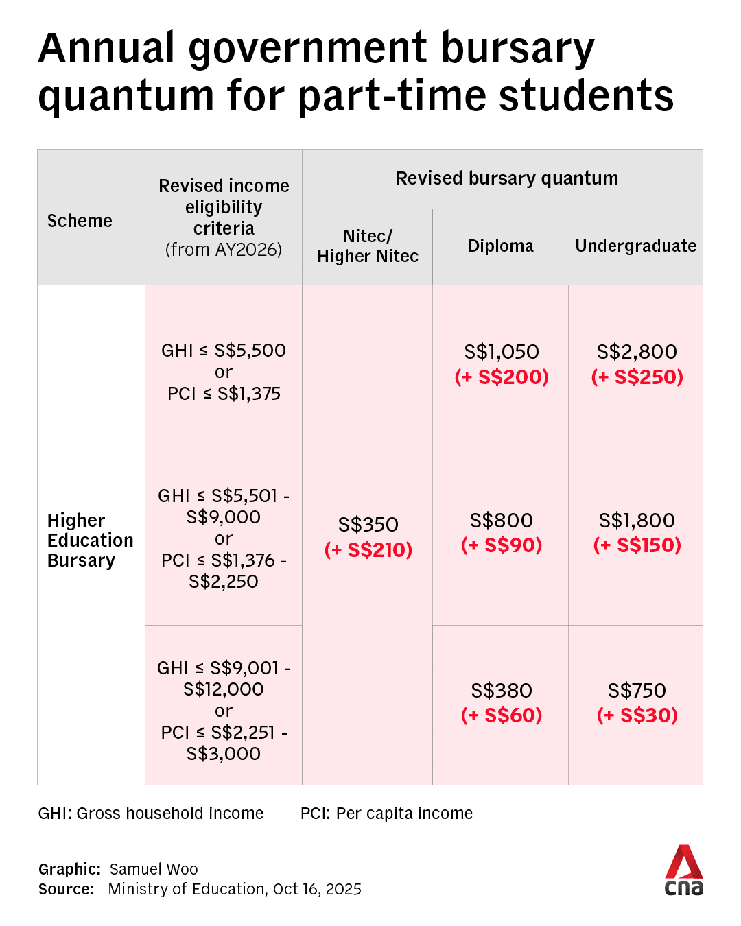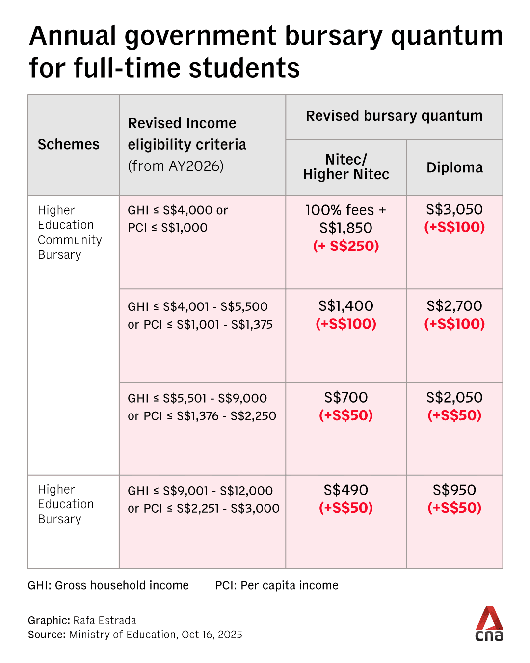 Most of the changes will commence from 2026 when the academic year starts, but the revised income criteria for the Edusave Merit Bursary will take effect from November to coincide with the upcoming bursary exercise that month and December.