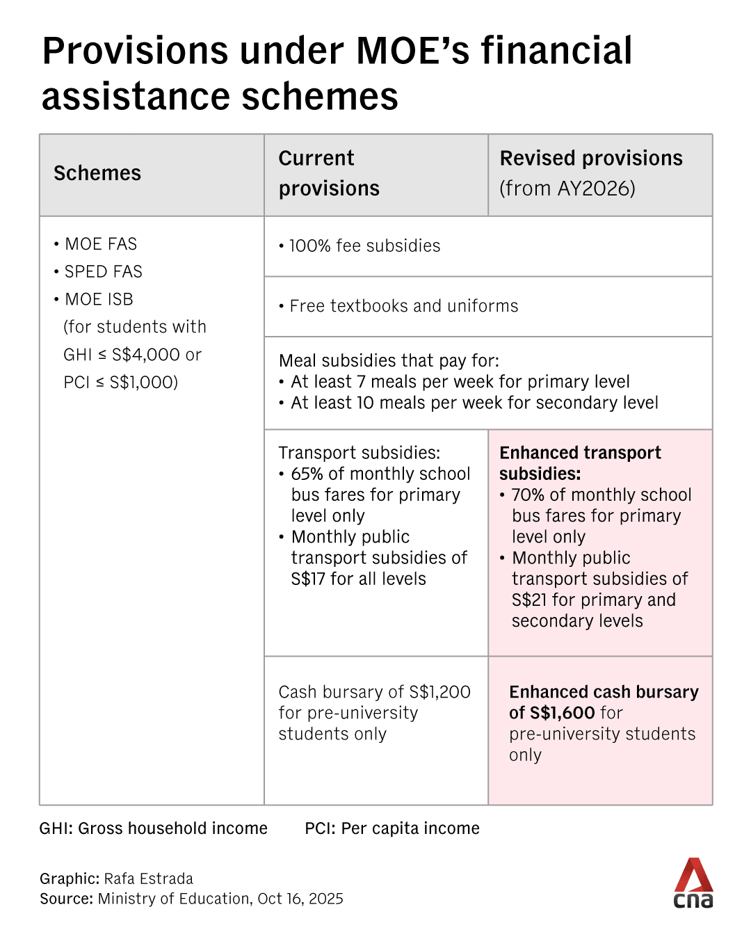 SINGAPORE: Higher income eligibility ceilings across financial assistance schemes offered by the Ministry of Education (MOE), and bigger transport subsidies for primary and secondary students from next year.